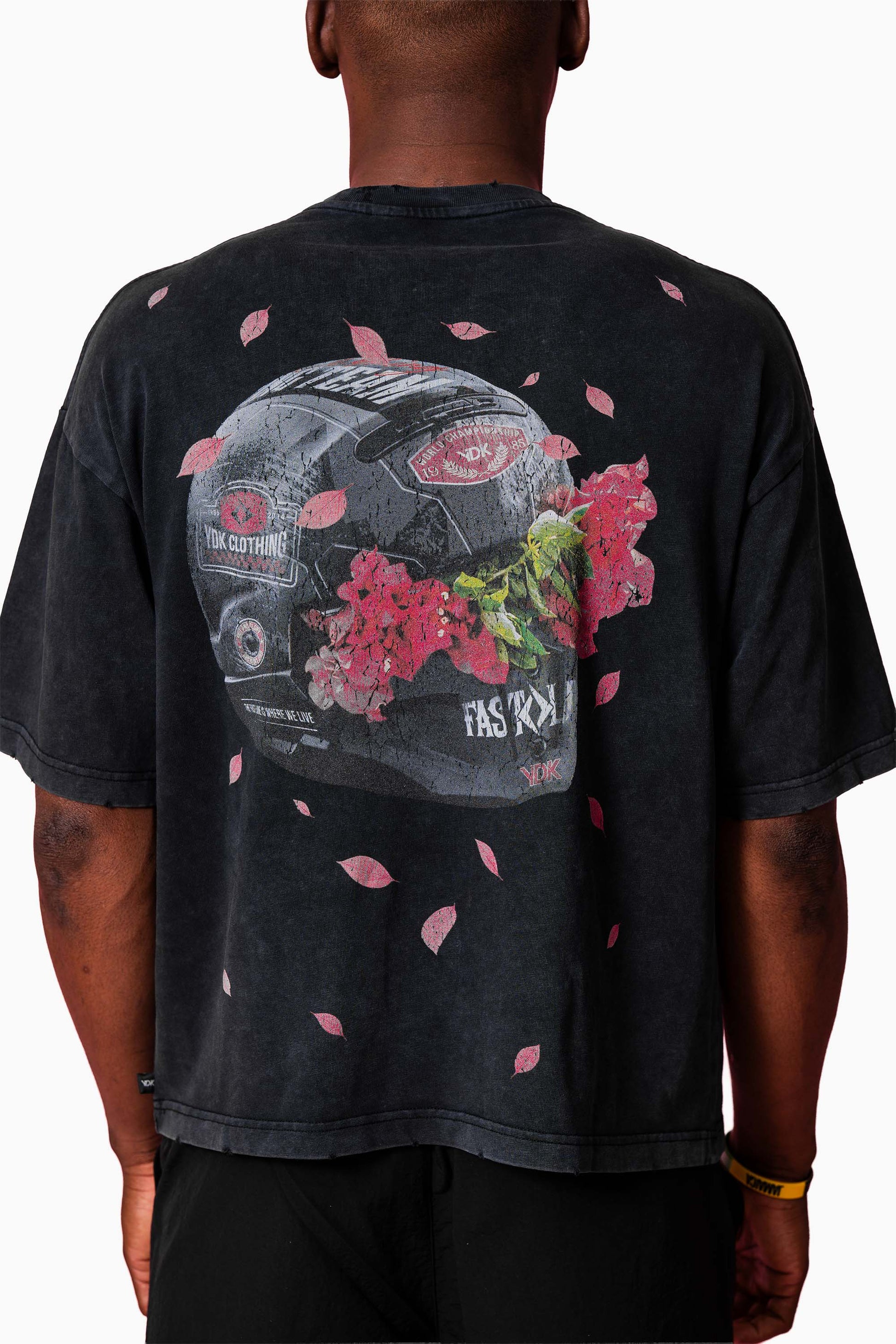 The back graphic commands attention: a racing helmet infused with florals, symbolizing the balance between aggression and beauty, speed and control. The front remains minimal with Fast Life detailing, keeping the energy focused and refined.